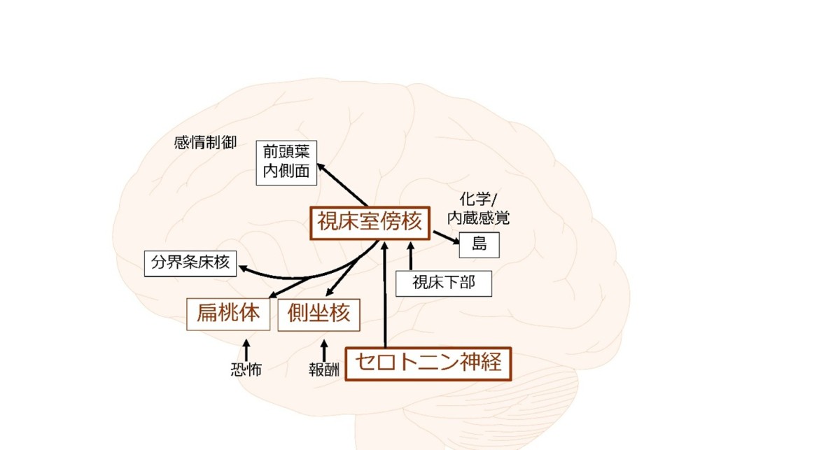 視床室傍核は、セロトニン神経からの強い投射を受ける一方で、その軸索は枝分かれして、恐怖に関与する扁桃体および報酬に関与する側坐核へ投射する部位です。視床室傍核は、強い生物学的意味(セイリアンス)を持つ外界の事象に対して反応することが知られていることから、感情の強さを制御していると考えられます。マウスで視床室傍核を操作すると、抑制した場合でも、刺激した場合でも、反復性のうつ様行動を示すことから、今回見出された視床室傍核の変化は、双極症の結果ではなく、原因であると考えられます。